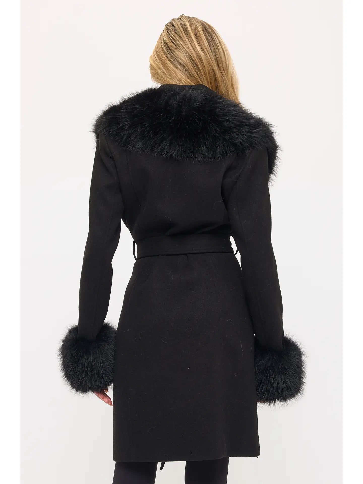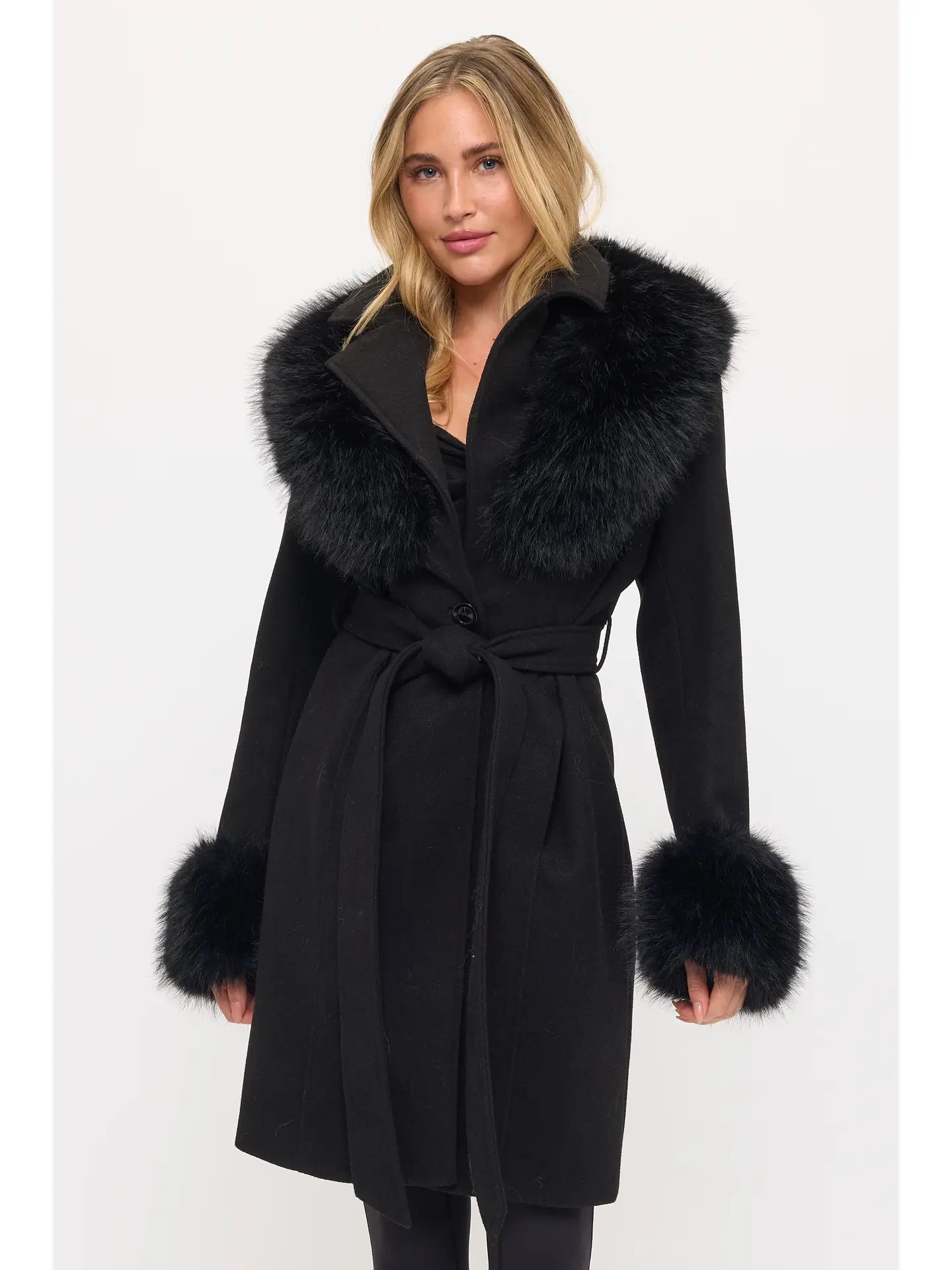 Wrap yourself in cozy charm with this belted black coat featuring plush fur trim. Its playful silhouette and soft accents add flair to chilly days, while the cinched waist keeps you stylishly snug. Perfect for turning frosty weather into a fashion moment. With removable fur !!!