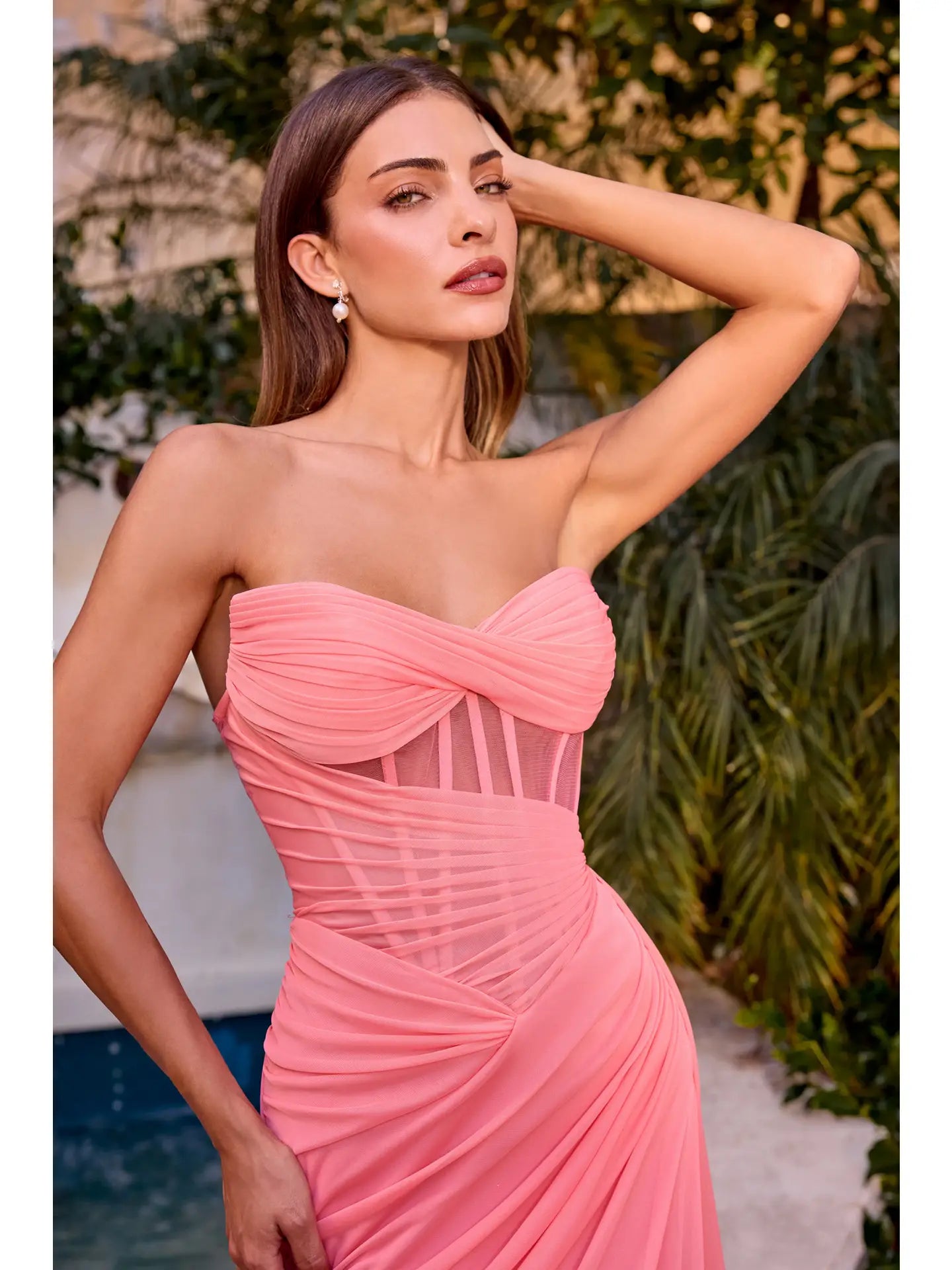 Slip into pure elegance with this stunning strapless gown that's all about drama and sophistication. The fitted silhouette hugs your curves in all the right ways, while luxurious draping cascades down the bodice for that swoon-worthy moment. In a gorgeous coral hue that's bold enough to turn heads but romantic enough for your special day, this gown strikes the perfect balance between modern and timeless. Whether you're walking down the aisle or dancing the night away, you'll feel absolutely radiant in this show-stopping dress.
