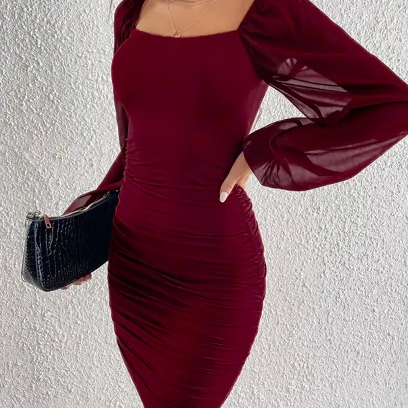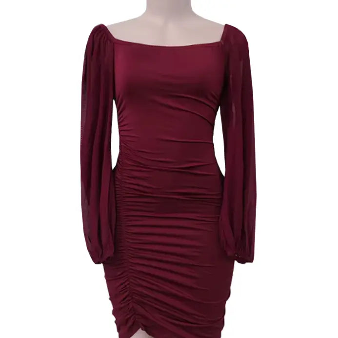 Turn heads in this playful wine-colored dress featuring a flattering square neckline and delicate pleats that add movement and charm. The fitted silhouette enhances your curves, making it the perfect choice for nights when you want to feel confident and effortlessly sexy. Whether it's a date or a party, this dress brings a flirty touch to your wardrobe.