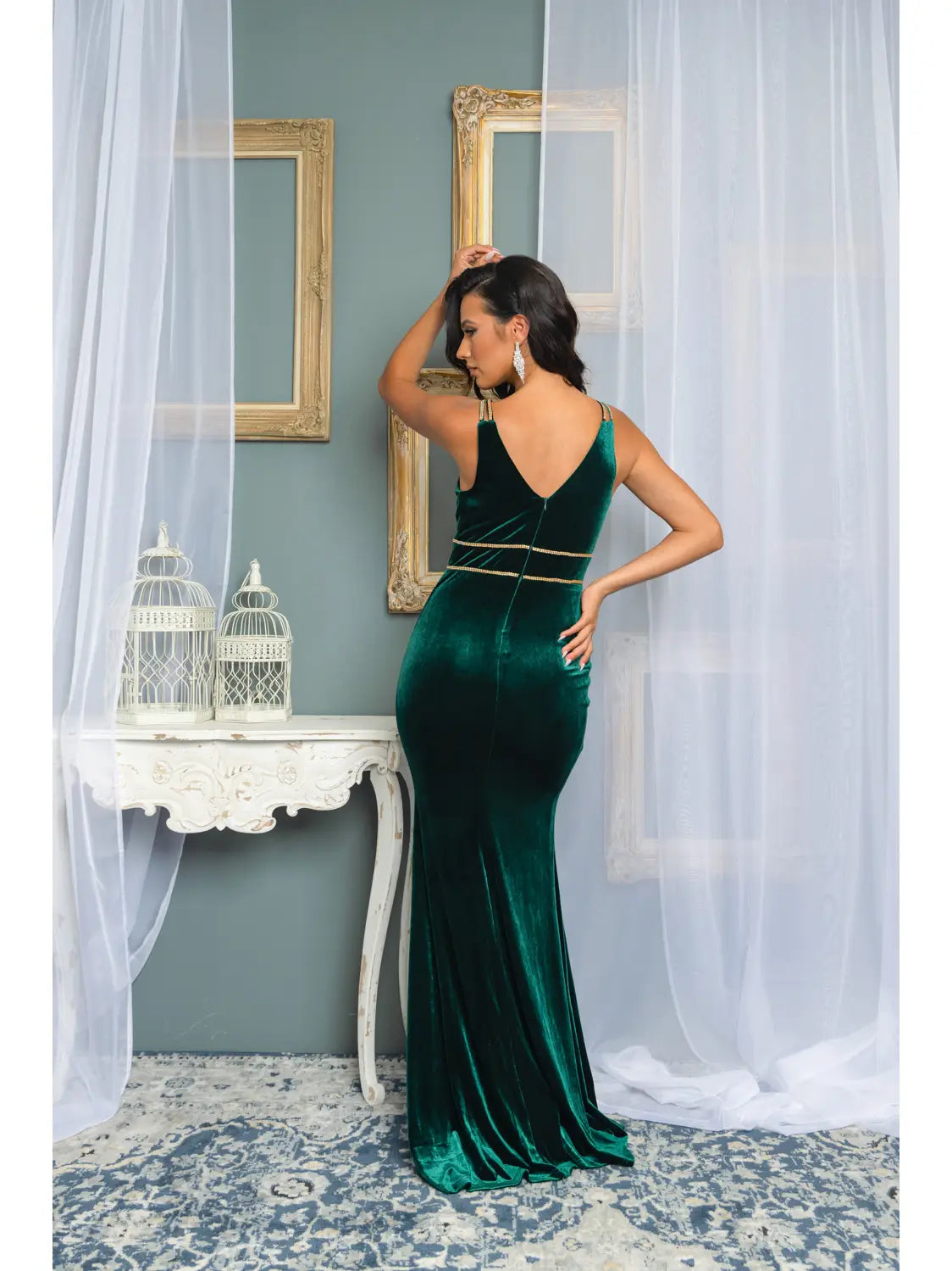 Slip into pure elegance with this stunning hunter green velvet dress that practically glows under the lights. The luxe velvet fabric drapes beautifully while the show-stopping double belt—adorned with sparkly gold accents—cinches your waist and steals the spotlight. Perfect for making a grand entrance at weddings, galas, or any occasion where you want to feel absolutely fabulous. This is the dress that turns heads and makes memories.