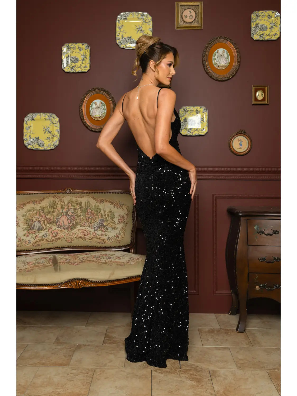 Turn heads in this stunning black sequin velvet gown that's equal parts glamorous and daring. The luxurious sequin detailing catches light with every movement, while the daringly low open back adds an unexpected touch of allure. Perfect for making a show-stopping entrance at your next special event, this dress proves that sometimes the back view is just as captivating as the front. Slip into elegance and let your confidence shine.