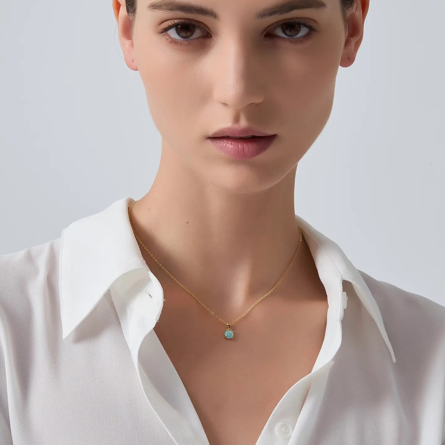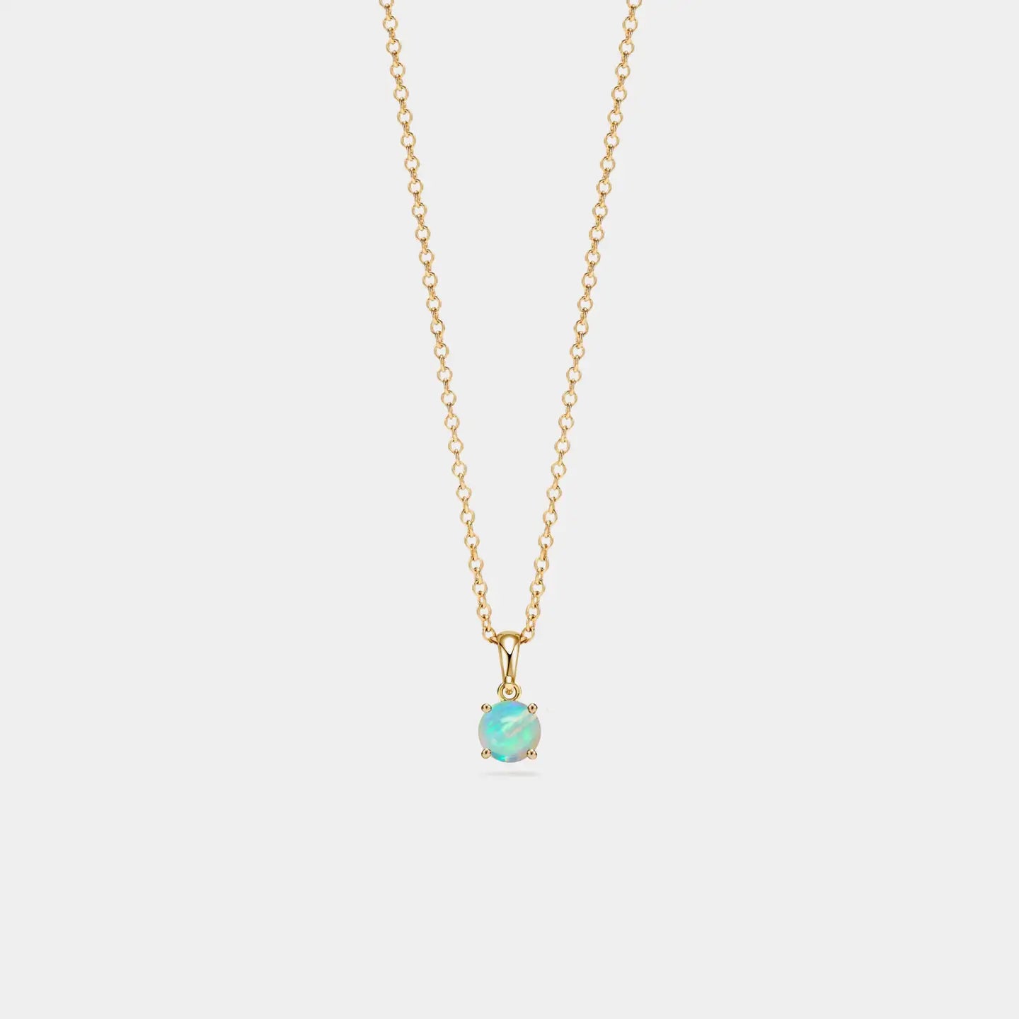 Catch the light and turn heads with this stunning solitaire round opal pendant necklace. The mesmerizing play of green hues dances across the opal's surface, creating a one-of-a-kind sparkle that shifts with every movement. Set in warm gold, this elegant piece brings a touch of natural magic to any outfit—perfect for adding personality to your everyday style or making a memorable statement at special occasions. A timeless treasure that celebrates the beauty of nature's most enchanting gemstone.