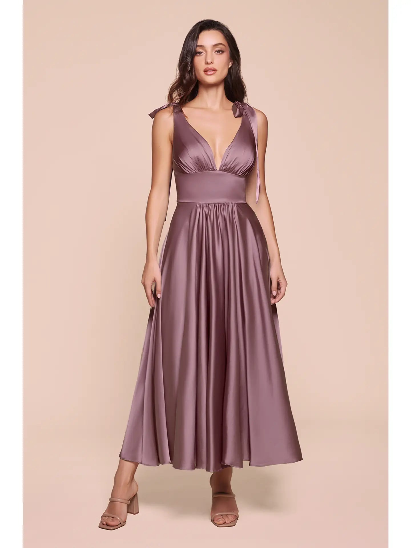 Grace the room in this playful tea-length satin dress in a gorgeous violet shade. Its flattering A-line silhouette glides effortlessly, offering both comfort and style for any special occasion. Perfect for twirling the night away, this dress adds a splash of vibrant elegance to your wardrobe.