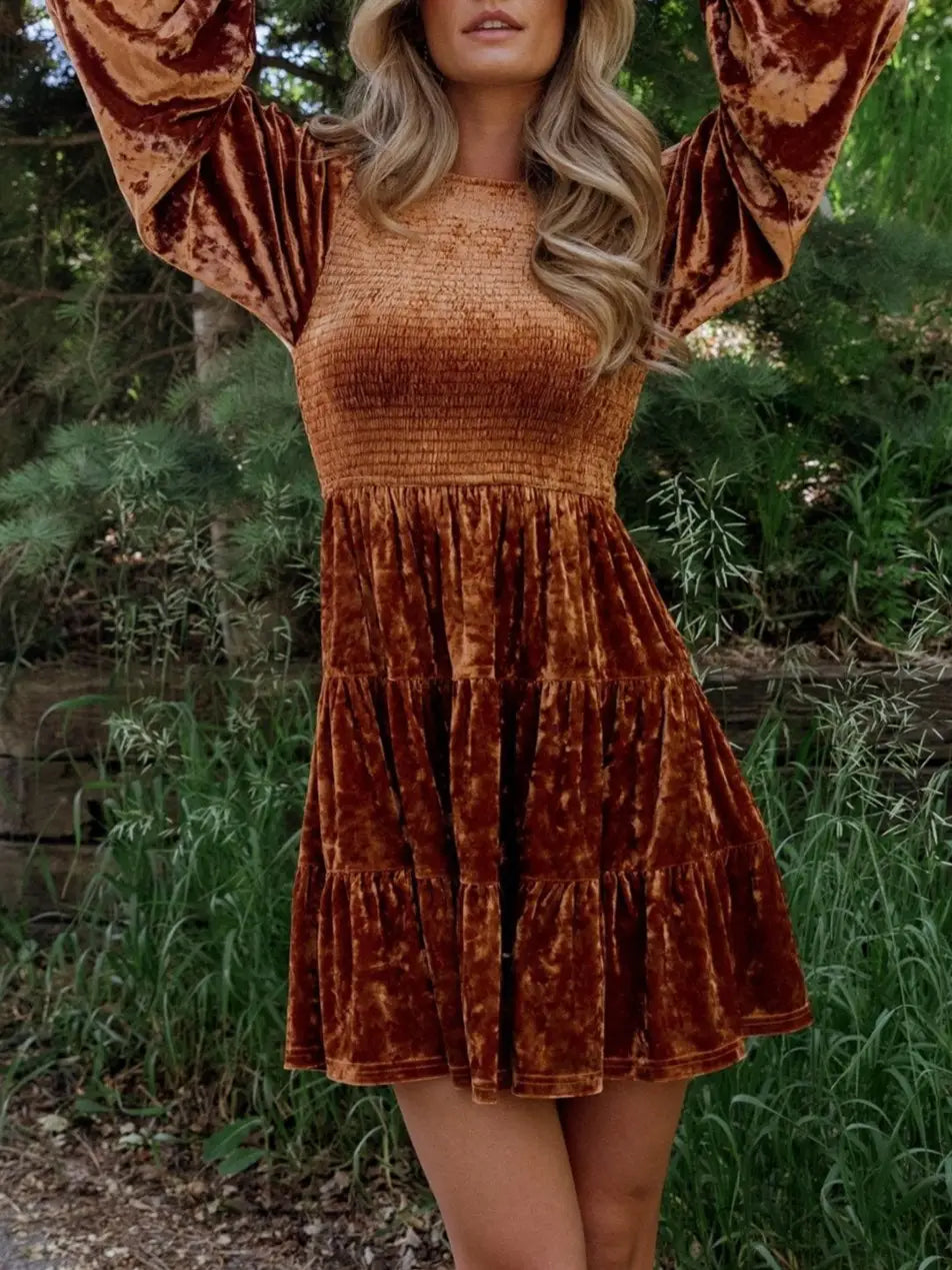Slip into luxe comfort with this stunning velvet ruffled crewneck dress! The rich brown and orange tones shimmer with an eye-catching shine, while delicate ruffles add playful dimension and movement. Perfect for making a bold statement at any occasion, this dress combines soft velvet texture with modern style. The classic crewneck keeps things chic and wearable, making it your go-to piece for turning heads and feeling fabulous.