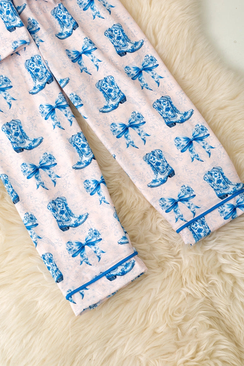 Saddle up for sweet dreams in this Western Coquette PJ set, featuring an adorable blue-tone cowboy boot print that's equal parts sass and comfort. Perfect for the modern cowgirl who loves a little whimsy with her bedtime style, this playful set brings ranch-inspired charm to your sleepwear collection. Cozy, cute, and ready to wrangle some quality rest.